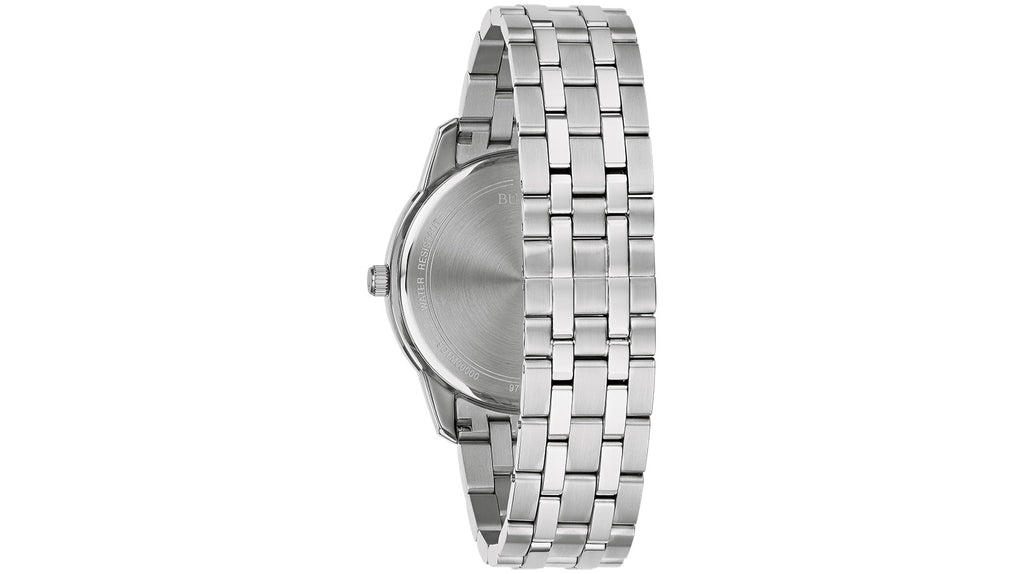 Stainless steel case and bracelet with a blue dial featuring a calendar window at the six o’clock postion. Domed mineral crystal. Deployant buckle.