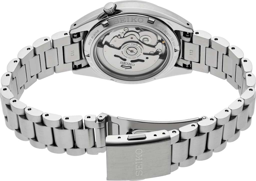 Show your style. Make your move. For over 50 years, Seiko 5 Sports has delivered consistently high levels of reliability, durability, and performance. Inspired by the best-selling SNXS series from the classic Seiko 5 collection of the past, this exceptional watch offers a compact case and bracelet design incorporating iconic elements of the original models with upgraded performance for today. Providing automatic technology that you control with every movement, this dynamic timepiece is powered by a 24-jewel movement that beats at a frequency of 21,600 vibrations per hour, with a power reserve of approximately 41 hours and manual winding capability. Framed by a metallic minute track, the deep blue dial features diamond cut indices with grooved top surfaces, a day/date calendar, and LumiBrite coating on the hands and markers for enhanced visibility in low-light conditions. Crafted of stainless steel with hairline and mirror finish, the sharply designed case has a low center of gravity for a comfortable fit and features a screw down see-through case back for a view of classic timekeeping in action, flowing seamlessly to a stainless steel bracelet with a tri-fold push button release clasp. 10 bar, 100M Water Resistant
