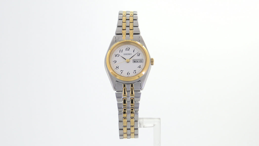 From the Essentials Collection. Offering classic dress/sport designs, the Essentials Collection provides the ideal solution for everyday wear. Crafted of stainless steel in versatile two-tone finish, this perfectly balanced watch features a white dial with Arabic numerals and day/date calendar for a superb blend of clarity and style. 10 bar, 100M Water Resistant